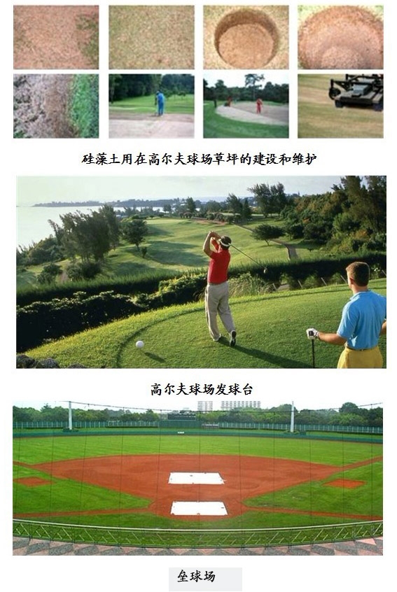 (2). 硅藻土用于高爾夫球場維護(hù):硅藻土用于球場維護(hù)是同打孔作業(yè)同時進(jìn)行的,球場春秋兩季打孔鋪沙的主要目的是打探黑土層和板結(jié),提高土壤的透氣性和滲透性。但是經(jīng)常打孔會影響營運,并且會使果嶺凹凸變形,球速下降,為此需要滾壓果嶺。這樣又造成土壤緊實,透氣性下降,形成惡性循環(huán)。